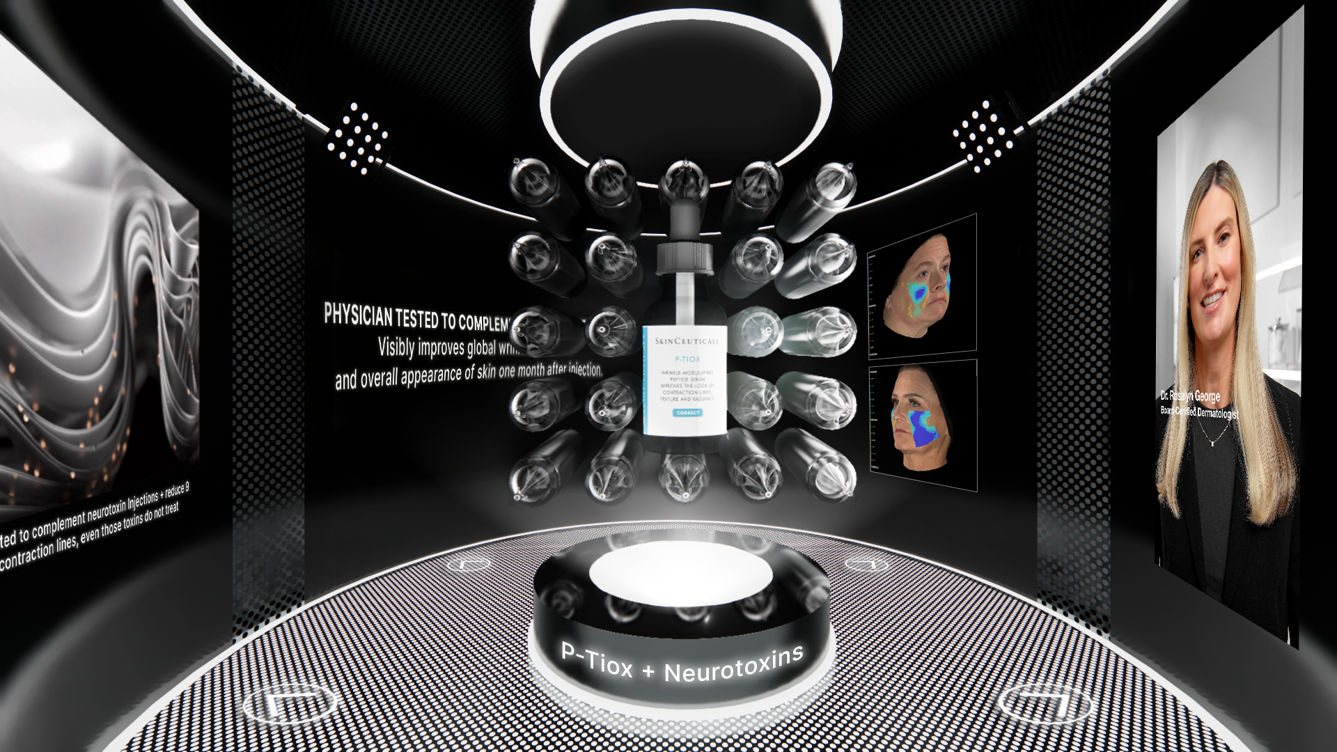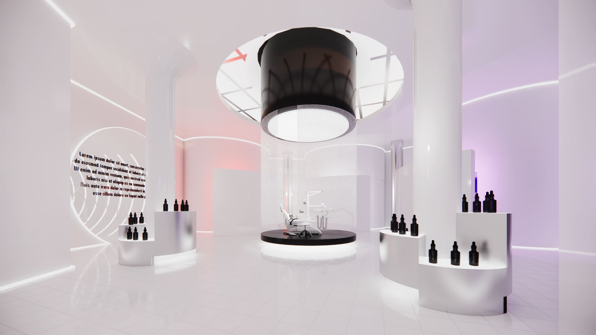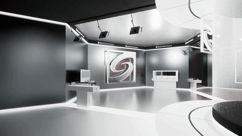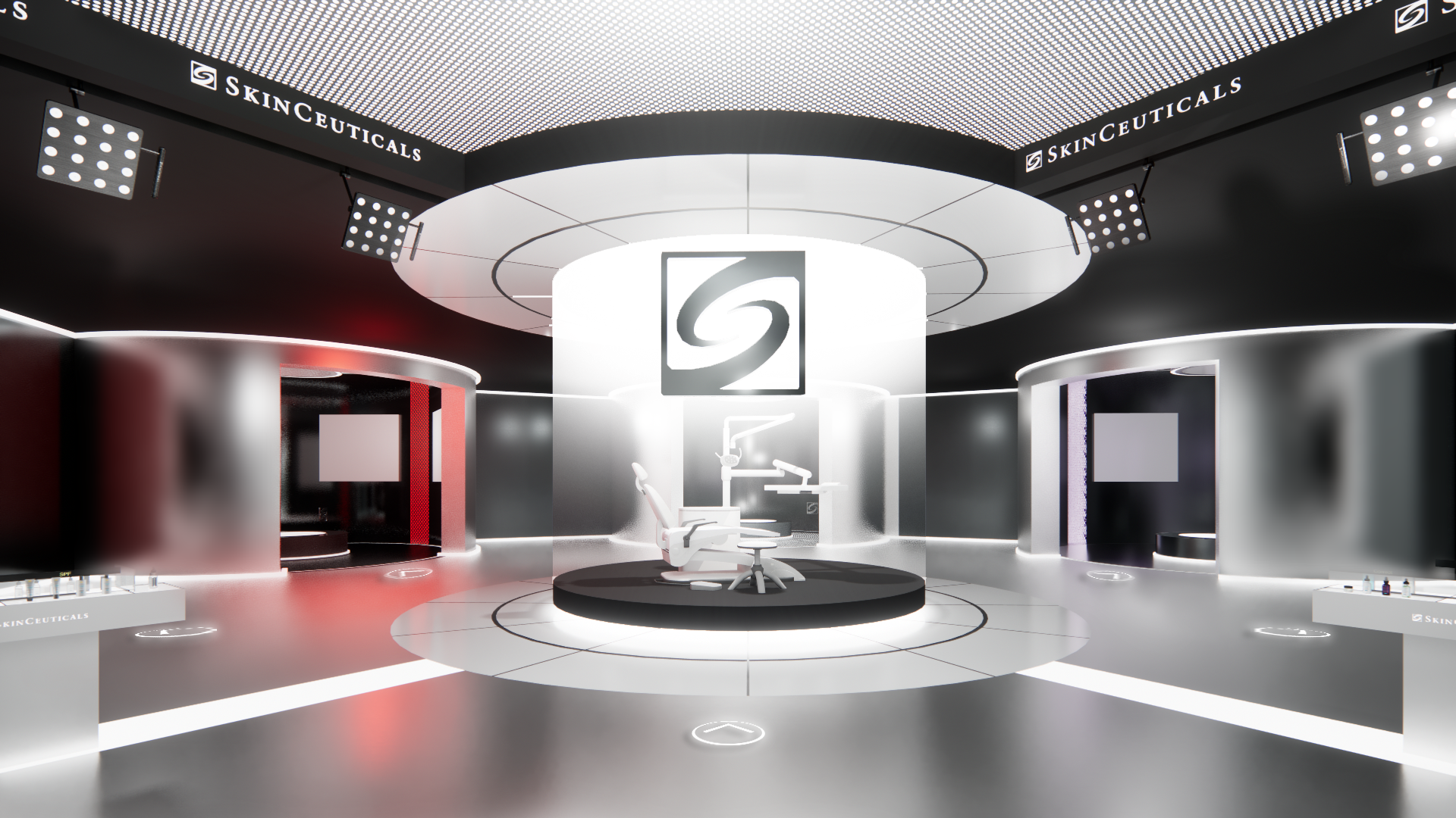 I designed an immersive digital environment modeled after a modern skin clinic. The central consultation space features a clinical chair surrounded by illuminated data displays that visually communicate key skin science insights.