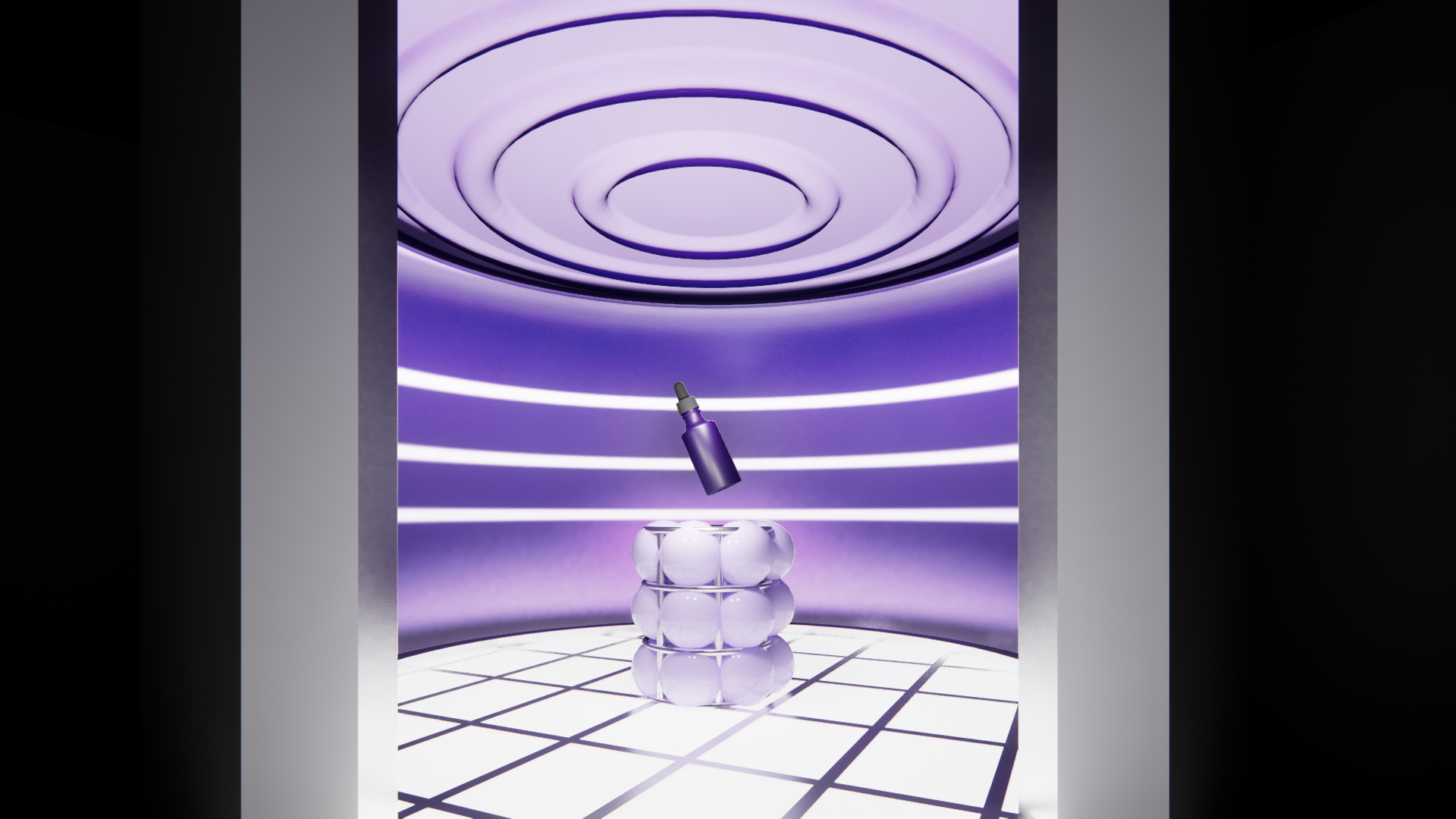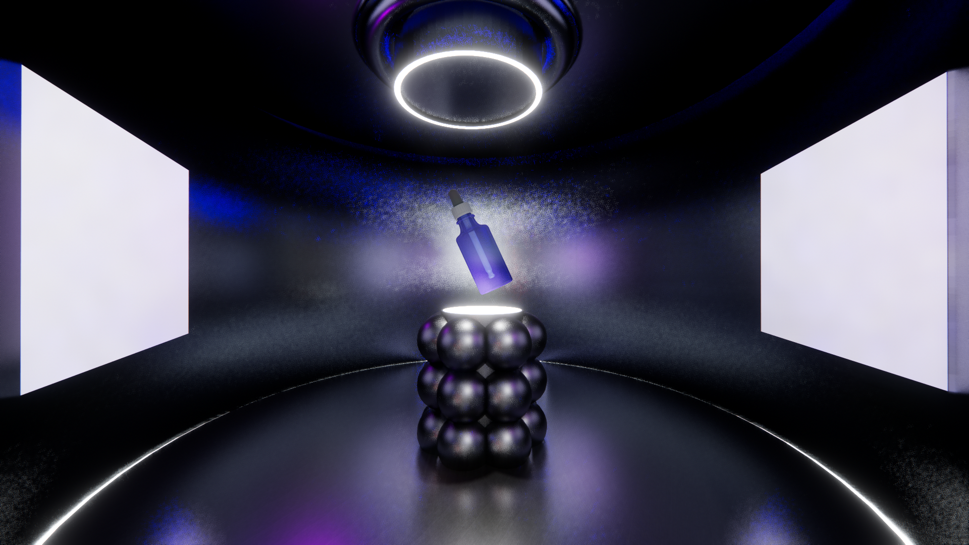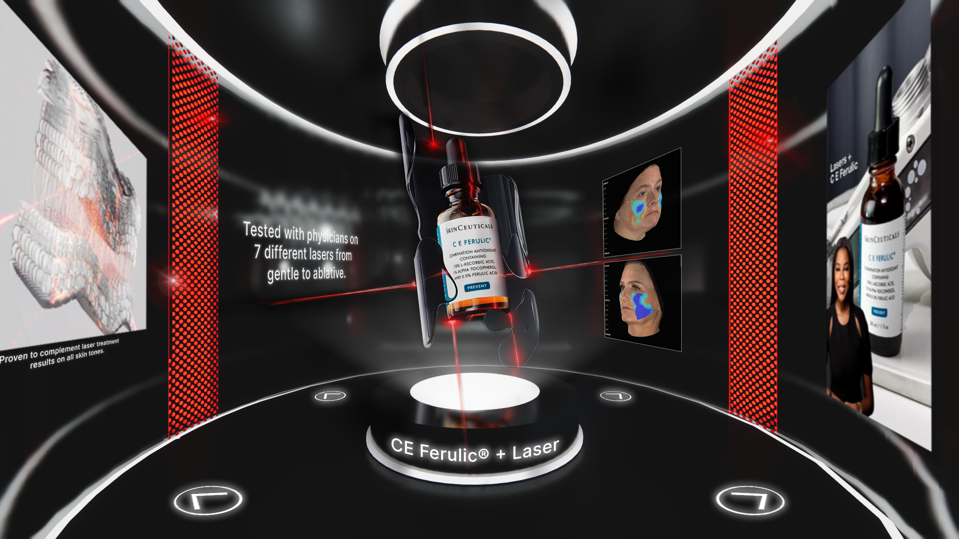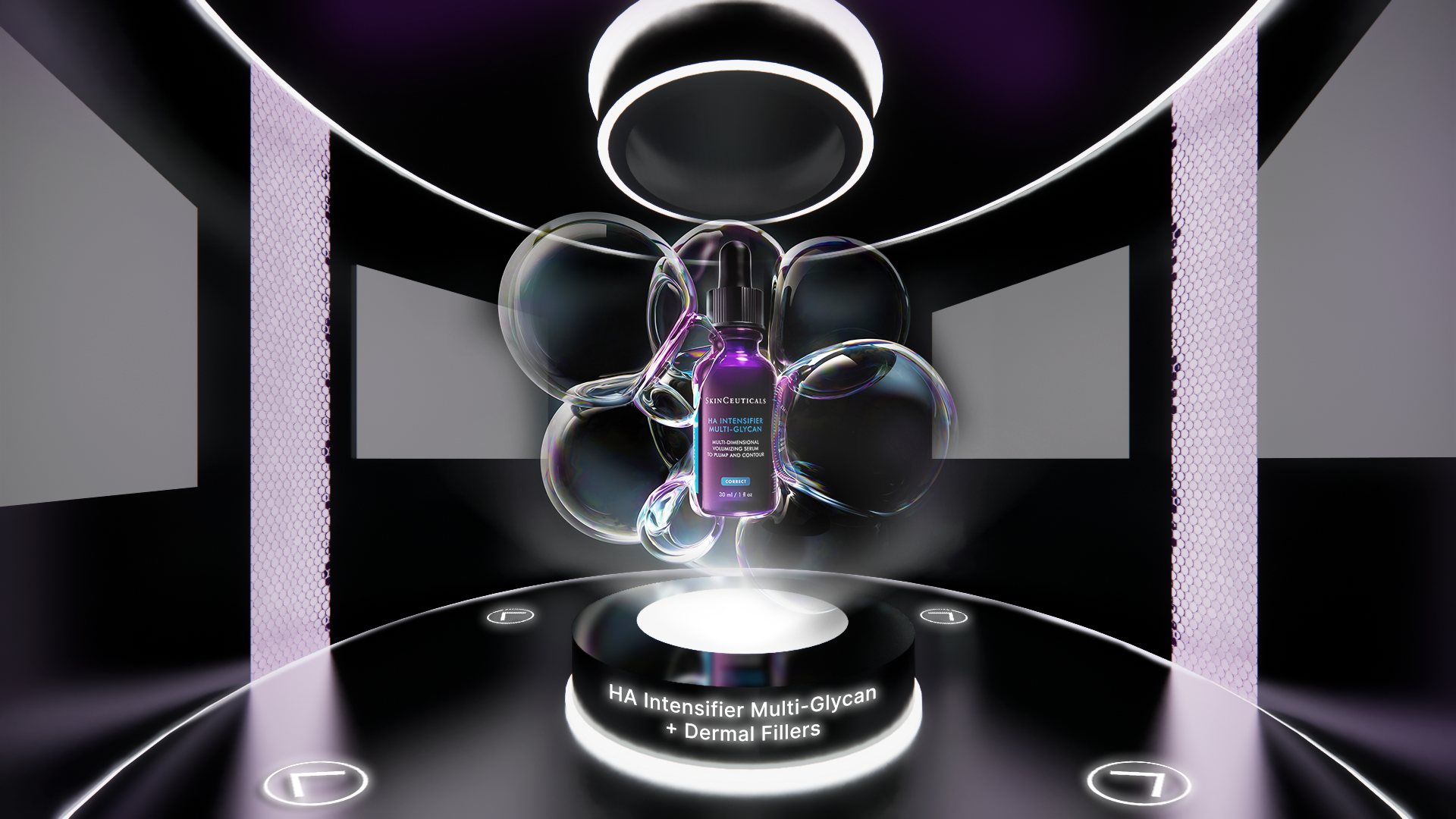 I designed an immersive digital environment modeled after a modern skin clinic. The central consultation space features a clinical chair surrounded by illuminated data displays that visually communicate key skin science insights.