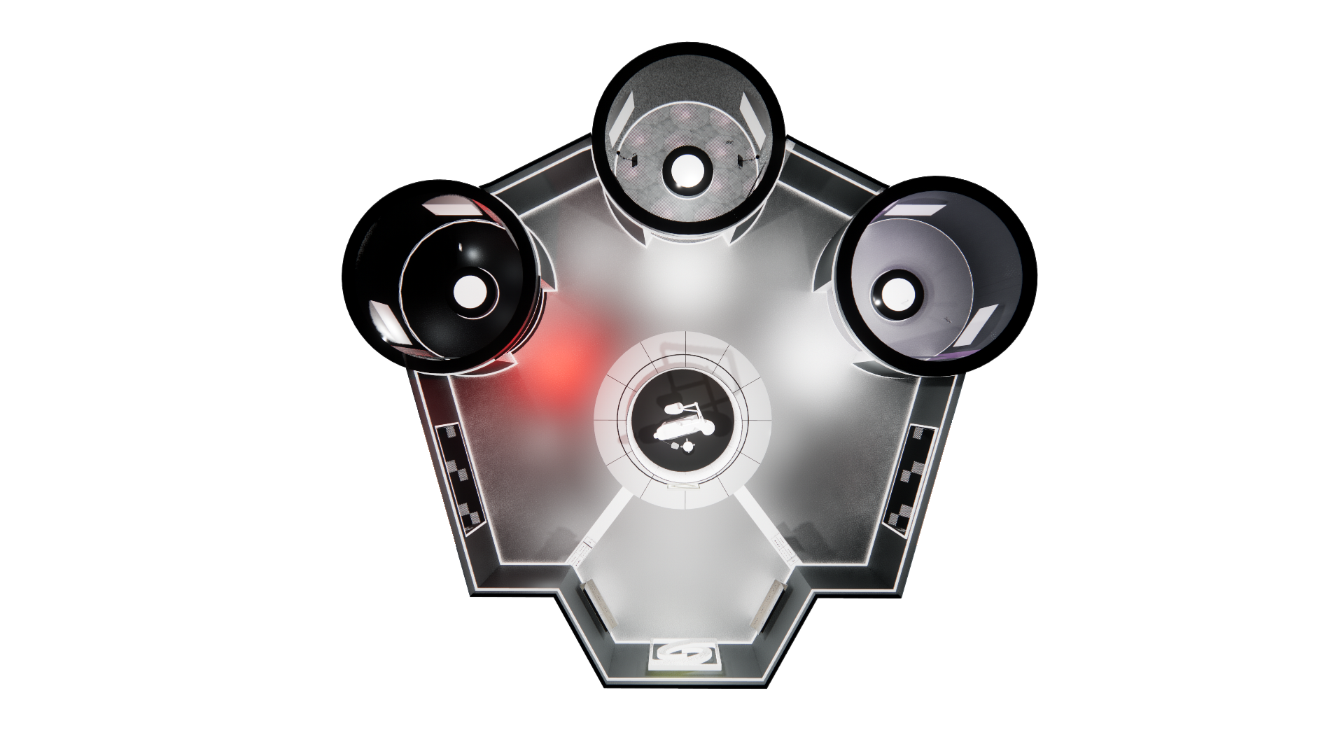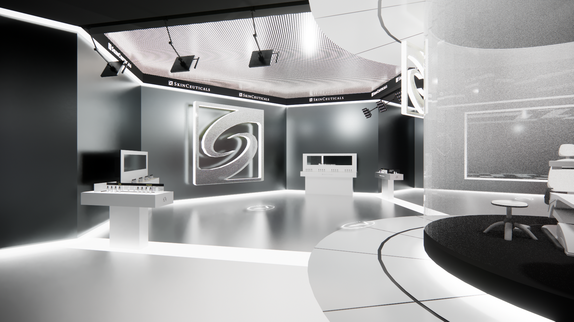 From this hub, visitors enter three treatment rooms dedicated to specific ISC pairings. Each room uses distinct forms, lighting, and spatial cues inspired by the procedures themselves—sharp red lighting for lasers, spherical forms for fillers, and precise linear elements referencing injections.