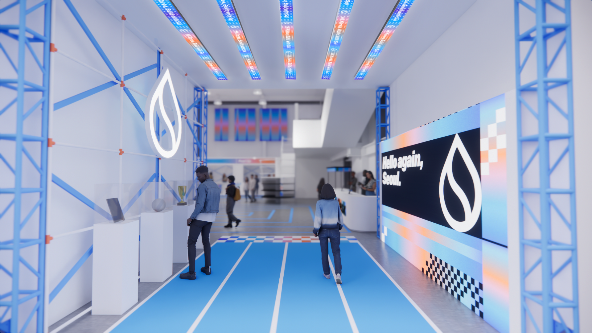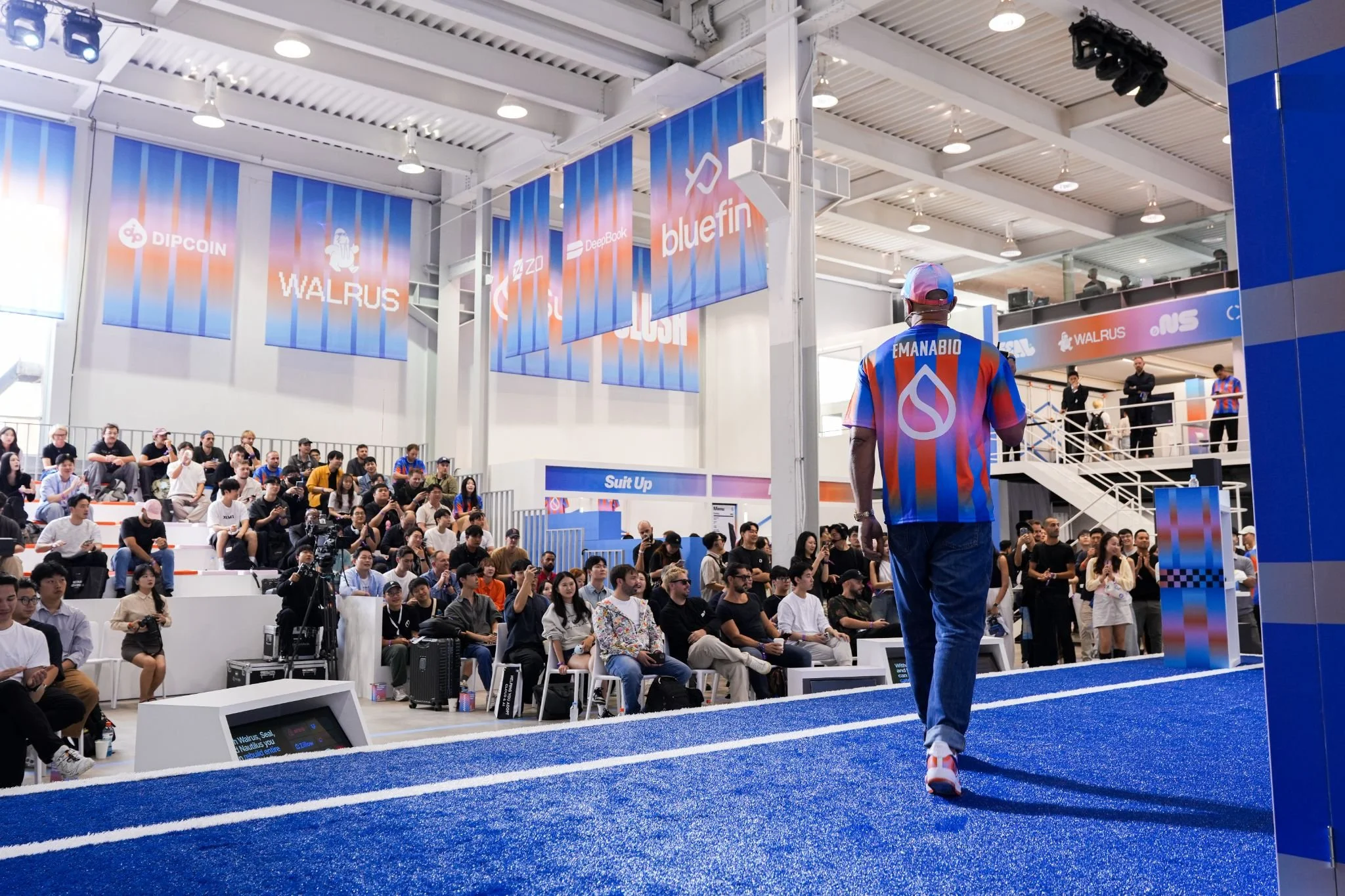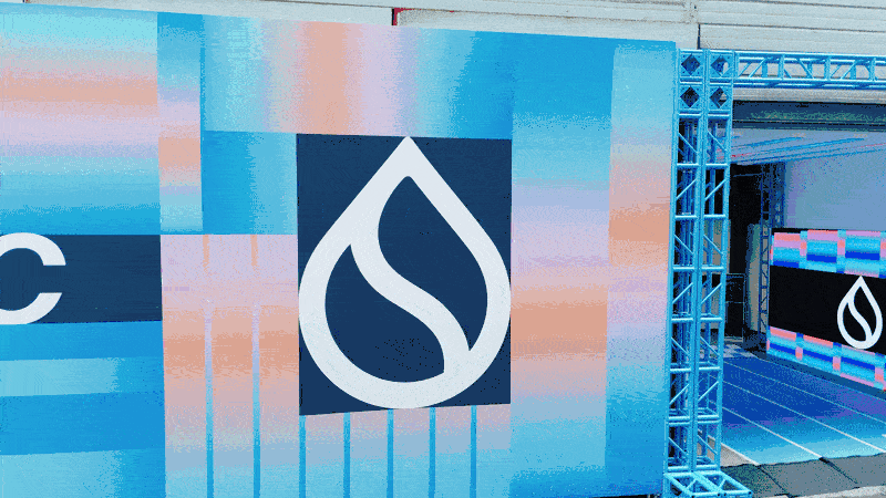 Conceptually, the experience was driven by a sports-inspired narrative anchored in the rallying cry, “Join Team Sui.” In a saturated blockchain landscape, the goal was to position Sui as a movement rather than just a platform. The environments incorporated the visual language of motion and competition — track lines running through the space, finish-line motifs, concession-style merch and F&B stands, and suspended flags that created an atmosphere of fandom and collective momentum.